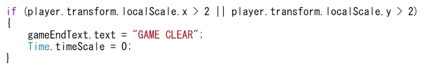 K「プレイヤーのサイズが一定以上だと、例えばここの2以上の場合(動作確認)こうGAME CLEARって表示される。」