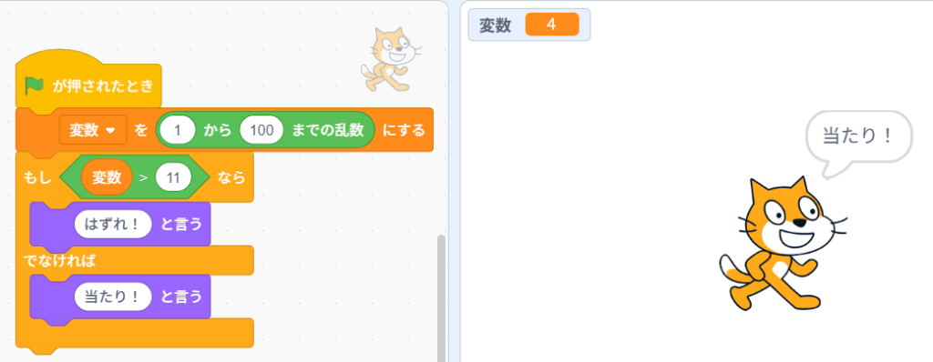 乱数のプログラムを実行すると、決めた数以下の数値がランダムで出るので、その数を見て続きのプログラムを書いていきます。
