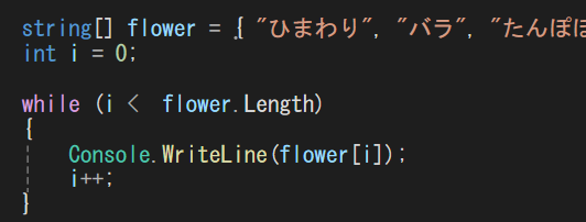 H「flowerの配列をまず用意して、whileでiがflowerのLengthになるまで今回は(花の種類が)10個だから10になるまで繰り返す。flowerの最初0を表示して、次にflowerの1だからこれ(バラ)を表示していく。」