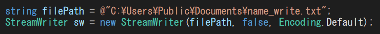 H「StreamWriterで書き込むファイルのパスとデフォルトの文字コードを使うことを指定して、自分の名前をWriteLineで書き出す。」