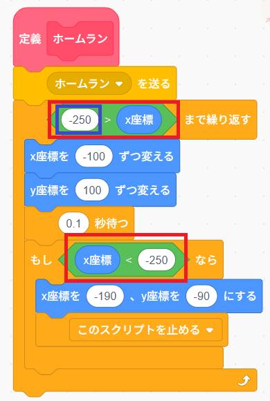「ホームラン」と「ファール」の処理をブロック定義を使って作成する課題に取り組んでいる途中でした。