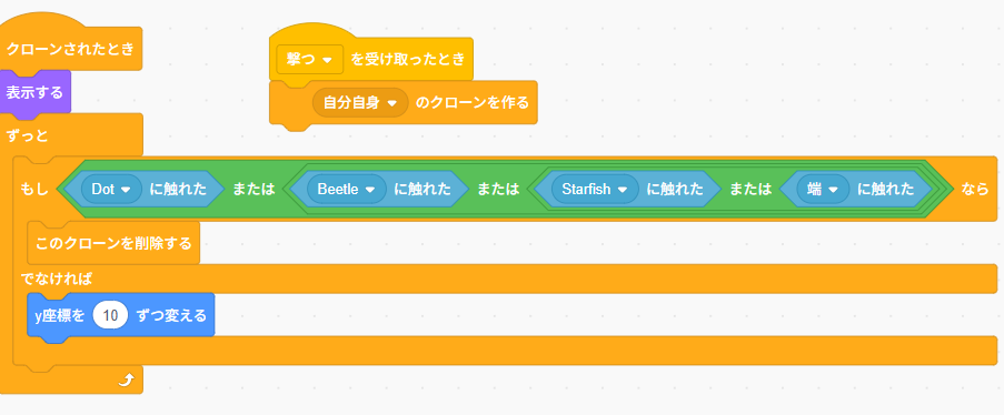 弾を発射する処理や、クローンを使った動きの制御などを実装していきますが、