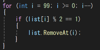 H「次に、99から。Listの番号が0からだから99番目から奇数かチェックをして、奇数だったら削除。」