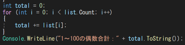 H「1から100までの数字をListに追加し、奇数を削除後残った偶数の合計を表示する。」